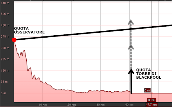 Sappiamo, quindi, la quota del punto di osservazione (350 m s.l.m.) ed abbiamo anche le informazioni della torre di Blackpool (172 m s.l.m.).